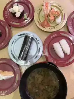 The sushi prices are categorized by plate color, making selection and price calculation easy. The price levels are as follows: