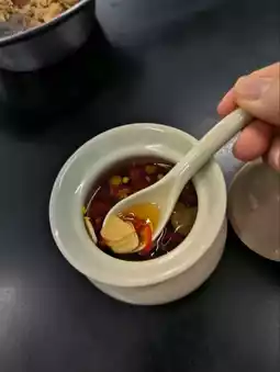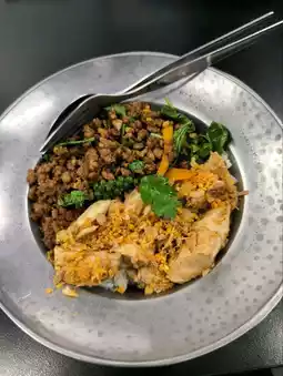 The "Two Hearts" menu is a split dish with two sides in one. On the left is non-spicy basil beef, and on the right is garlic chicken. They also have a fish sauce with chili and fermented fish for added flavor. The chicken is tender and not dry. Today, I liked the garlic chicken the most. The basil beef has a bit of tendon, requiring a lot of chewing. It's 130 baht, and a bottle of water is 15 baht.