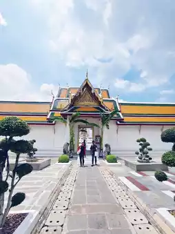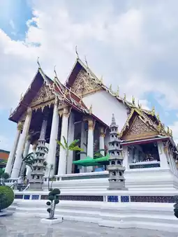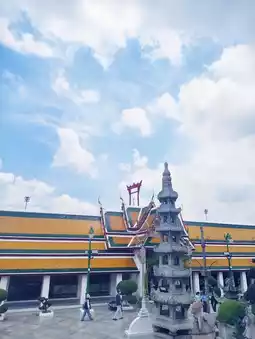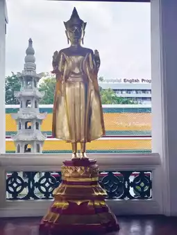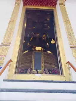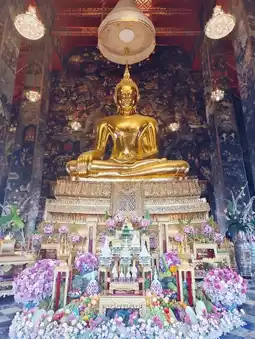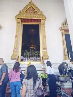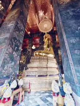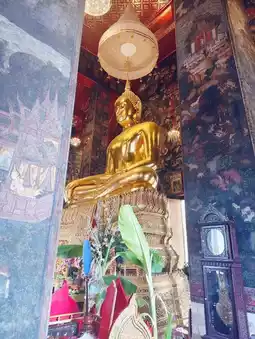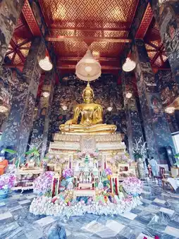 #GetDiscountNotDependingOnLuck Wat Suthat Thepwararam [Su-tat-thep-pa-wa-ra-ram], or popularly known as Wat Suthat, is a first-class royal temple of the Ratchaworamahawihan type, which exists in only a few places in Thailand. It is considered the temple of the reign of King Ananda Mahidol, the Eighth King. It is a temple located in the inner city area and has a prominent structure, the Giant Swing, in front of the temple. In the early Rattanakosin period, King Rama I[1] ordered the construction of a temple in the inner city area in 1807. Originally named "Wat Maha Sutthawat", the area was located in Dong Sakae, a low-lying area, so he ordered the land to be filled and a temple built. He also ordered the construction of a viharn (wihan) first to enshrine the Phra Sri Sakyamuni (Phra To), which was invited from the royal viharn of Wat Mahathat, Sukhothai Province. However, before the temple was established as a sangkharam, it was later called Wat Phra To, Wat Phra Yai, or Wat Sao Chingcha. It was not until the reign of King Rama II that the temple was extended and he carved the doors of the viharn himself. However, his reign ended before the temple was completed. The temple was completed in the reign of King Rama III in 1847, and it was named "Wat Suthat Thepwararam." It is recorded in historical records as "Wat Suthat Theptharam." During the reign of King Rama IV, the principal Buddha images in the viharn, the ubosot, and the sermon hall were given the same names: "Phra Sri Sakyamuni," "Phra Phuttha Trilok Chet," and "Phra Phuttha Setthamuni."