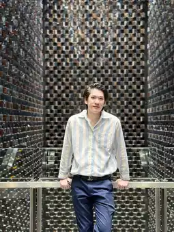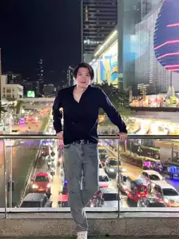 It's decorated in black tones and has a glass balcony. It's on the seventh floor, so anyone can take photos. This angle is highly recommended because it looks amazing.
