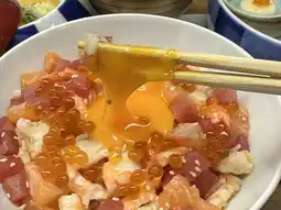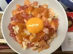 Thick salmon slices on top of rice + premium egg yolk / toppings as per the menu