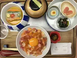 Sis... If you're looking for a special meal that's not as heavy as a buffet, but still gets you a variety of dishes, this donburi is like a delicious combo. The aroma of salmon, wagyu, crispy fried shrimp, fresh, cooked egg yolk, and fragrant, creamy Japanese rice is perfect.