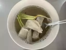We chose to sit upstairs, with the air conditioning on to cool off a bit. We started with a light dish: "Braised Bamboo Shoot and Mushroom Soup." It was a piping hot and easy to swallow. Next, we ordered "Hainanese Chicken Rice." The chicken thigh and drumstick had thin, golden-brown skin, tender meat, and crispy, not tough skin. The rice grains were evenly distributed and cooked perfectly, not too mushy. The soybean paste and Hainanese sauce were served. I accidentally poured the sauce over the chicken, and the first bite of rice... oh my, I finished the whole plate without adding any seasoning.