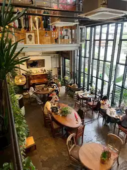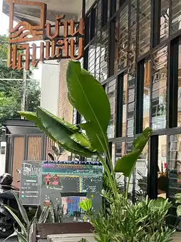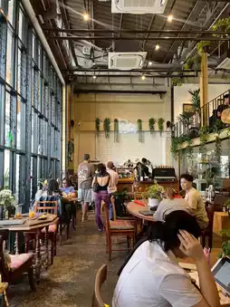 This cafe is located by the Saen Saep Canal, perfect for chilling out or working. Surrounded by lush greenery, the shop is super cute and has plenty of photo spots. The two-story cafe is quite spacious and has many tables to choose from. The prices for snacks and drinks are moderate and not too expensive (I forgot to mention they also have a guitar and piano. Play three songs and get a free drink). They also have clothing stores, a nail salon, a board game shop, and more. You can even pet a cute cat! 🐈☘️💻