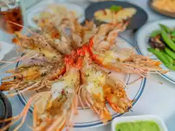 🦞 Seafood dishes, including grilled river prawns, succulent mantis shrimp, Korean oysters, and blue crabs.