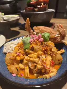 Their Spicy Papaya and Pomelo Salad, with soft shell crab, crispy shallots, and sweet pomelo, is a true feast for the senses! Every bite exudes the rich flavors of Thailand, leaving you wanting more! 🥳