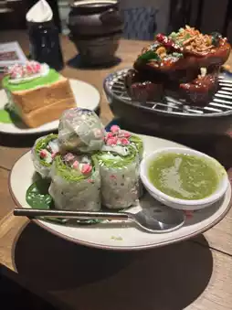 First and foremost, their shrimp rice paper rolls are a must-try! Filled with shrimp, vegetables, and edible flowers, and served with a spicy sauce, they're refreshing and layered! Every bite will bring you the vibrant energy and passion of Thailand! 🌸