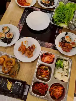 • เครื่องเคียงจัดเต็ม: นอกจากเนื้ออร่อย ๆ แล้ว เครื่องเคียง (Banchan) ก็มีให้เลือกหลากหลาย ไม่ว่าจะเป็น กิมจิ 🌶️, ต๊อกบกกี, คิมบับ 🍙, และผักสดต่าง ๆ รวมถึง ใบงา ที่มีให้แบบไม่อั้น!