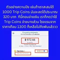 ❓What are Trip Coins? Trip Coins are coins in the Trip app that can be used as cash to discount hotel, flight, and tour packages within the Trip app. 100 Trip Coins are worth $1 USD, or approximately 33 THB. Their value fluctuates depending on the exchange rate. This is why we see Trip Coins increasing or decreasing.