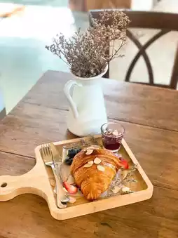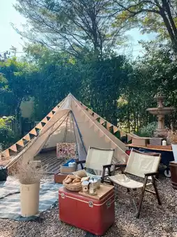 Outside, there's a relaxing corner in the garden 💐. The shop currently has a camping-style area 🏕🏕 for photo opportunities. A little further down is the swimming pool, where you can enjoy a cup of coffee ☕️ and chill.