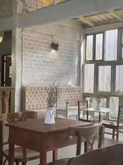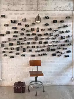 The interior is decorated in a vintage style, open and airy. The drink counter is in the middle, with a small piano corner to the side. There's also a corner decorated with various camera models as a background, perfect for taking cool photos.