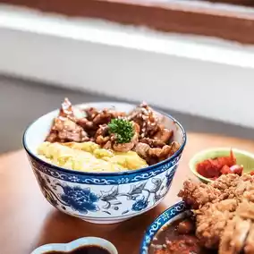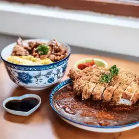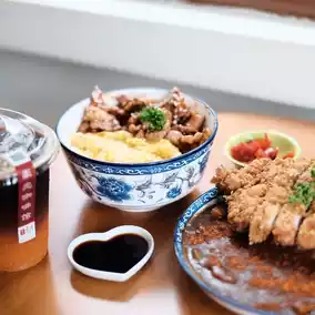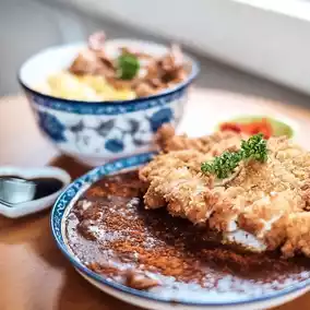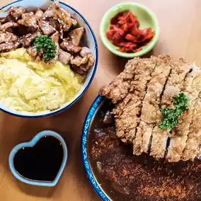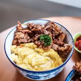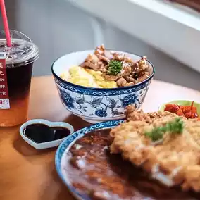 Today, we ordered the fried pork curry, teriyaki pork with thick egg, and orange coffee. Prices are 119, 99, and 70 baht, respectively.