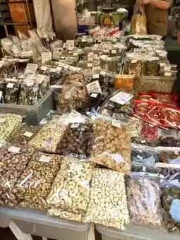 At the dry goods store, which sells bagged dried fruits and nuts, cashews and almonds cost around 150-300 baht per 100 grams, making them perfect as souvenirs.