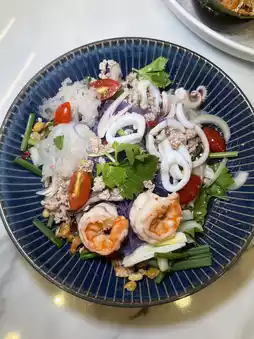 Karmurb, a Thai restaurant located in the Charoen Krung area, offers delicious Thai cuisine in a modern, white-toned setting with a great atmosphere. The menu features a variety of appetizing dishes, all beautifully presented. Each dish is served in generous portions, reasonably priced, and packed with flavor. Highly recommended dishes include: