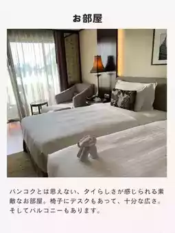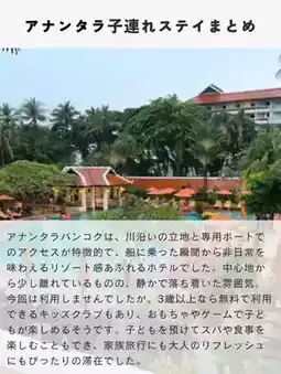 We stayed at Anantara Riverside Bangkok. While it's a little far from the city center, the lush grounds and waterfront views along the Chao Phraya River give you a resort-like feel right in Bangkok. The hotel is accessible by private boat or taxi, and the extraordinary experience begins the moment you step aboard. There's also a kids' club for children aged three and over, offering toys and games for free, so you can leave your kids there while you enjoy the spa and restaurant. With a spacious pool and spacious rooms, it's a comfortable place for both family trips and adult-only stays. It was a wonderful hotel, offering a quiet and relaxing experience in the heart of Bangkok. ✨