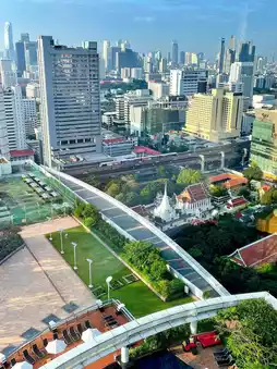 The rooms are modern and spacious, with stunning panoramic city views 🏙️. Some rooms offer romantic nighttime views of Bangkok 💫. Facilities include a rooftop pool 🏊♀️, a fitness center 💪, Cenvaree Spa 🧖♀️, and a tennis court 🎾, perfect for a relaxing getaway.
