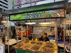 If you're looking for a fun, delicious, and relaxing nightlife spot in Bangkok, JODD FAIRS Ratchada is the place for you! 🎉 This vibrant market offers a wide variety of street food, from signature dishes like grilled pork, jim jum (grilled pork), boat noodles, and spicy salads, to chic desserts and juices. 🍜🥤 Plus, there are chic fusion restaurants that add a touch of charm.