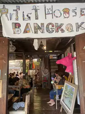 If you're looking for a place that feels like you've been transported to an artistic world and the tranquility of an old community, Artist House Bangkok, Khlong Bang Luang, is the answer you shouldn't miss! Located along Khlong Bang Luang Canal in Phasi Charoen District, this over 200-year-old wooden house has been renovated into a gallery, cafe, and creative space for both locals and tourists.
