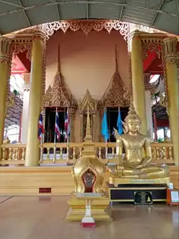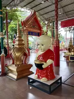 In front of Wat Rat Sattha Tham, after crossing the Bang Chan Canal Bridge, a very prominent landmark is the "Buddha Statue in Emperor's Royal Attire" in the "Opening the World" posture, with both hands raised to bestow blessings on the three worlds: heaven, the human world, and the underworld.
