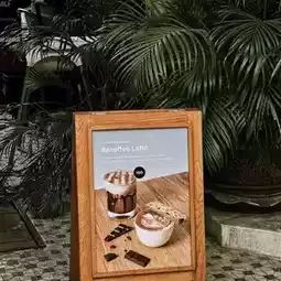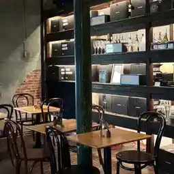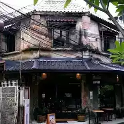 The shop is located in an old "Shop House" building, renovated into a chic cafe with exposed concrete walls, bricks, and plants, adding a classic industrial charm.