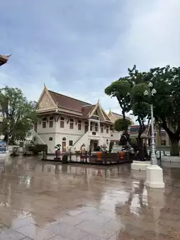Wat Ratchabophit Sathit Maha Simaram Ratchaworawihan is a royal temple located in the heart of Bangkok. The temple features a beautifully decorated ordination hall with traditional Thai architecture, and at its center stands a golden chedi. Even the walls are adorned with golden patterns, making it a stunning sight. On weekends, both locals and tourists visit to take photos, as the temple provides a picturesque backdrop. It's an ideal place to bring family, friends, or loved ones for a visit and to make merit. On the day of the visit, there were not many monks around. Surrounding the temple, there are shops renting traditional Thai costumes at reasonable prices, which are especially popular among Chinese visitors who enjoy wearing them for photos.