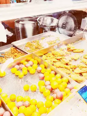 Their crispy banana fritters and golden sweet potato balls are hot, crunchy, and perfectly sweet—ideal for a quick treat while exploring the market.