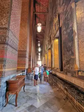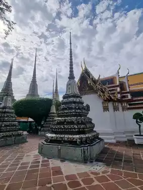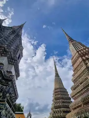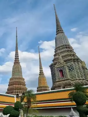 Atmosphere: Wat Pho is an ancient temple with a long history and is renowned both in Thailand and abroad. It's located near Wat Phra Kaew and the Grand Palace, making it an easy walk away. The temple grounds are spacious and surrounded by a variety of Buddhist structures, including the Ubosot (ordination hall), the Vihara (wihan), the main chedi, and smaller chedis, all lined up around the temple grounds. They're decorated with colorful and delicate glazed tiles, creating a truly beautiful and delicate atmosphere. Walking around the temple grounds, you'll see Buddha images in almost every corner. The atmosphere is also shady with large trees and small gardens throughout.