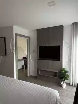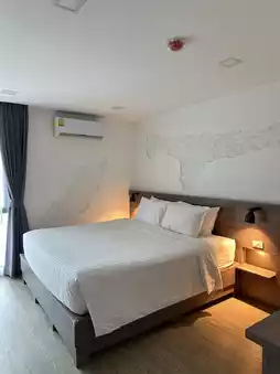 This is a 100/10 place to stay near Ratchada. I'll definitely be back. This hotel is near Huai Khwang Market, perfect for a late-night meal. Parking is convenient, and the staff are attentive and helpful. The room is beautiful and clean, divided into four sections, which is great. I love it! The bathroom has two doors, two air conditioners, which is great! There are two TVs, and the bed is very comfortable. There are mini-bar snacks and a dressing area.