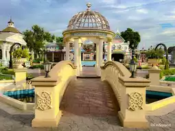 there are pastel-colored wooden houses, a clock tower, a water bridge, and a small canal that cuts through the garden.