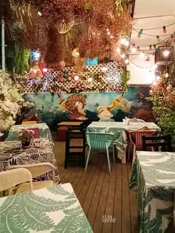The highlight of Laap Paak is its charming decor. The front of the restaurant is a small garden lined with a variety of flowers and vines. There's a photo corner set up for the table. The back wall is decorated with cute, artistic paintings, perfect for art lovers.