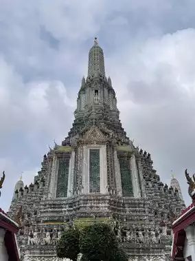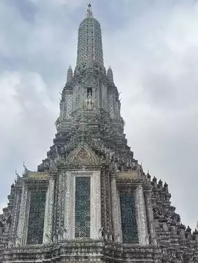 Rising majestically along the Chao Phraya River, Wat Arun's iconic prang (tower) showcases Khmer-inspired architecture covered in millions of hand-laid Chinese porcelain pieces.
