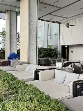 The pool area, surrounded by sleek loungers and tropical greenery, creates a resort-like atmosphere in the heart of the metropolis.