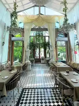 The interior is decorated in a slightly vintage style, with warm wood accents and the fragrance of dried flowers. 🌾 Every corner is a photo opportunity, whether it's the front garden, the fountain, or the glass-fronted room, which offers stunning natural light. 📸 Perfect for cafe lovers, photography enthusiasts, or couples looking for a relaxing dinner. 🍷