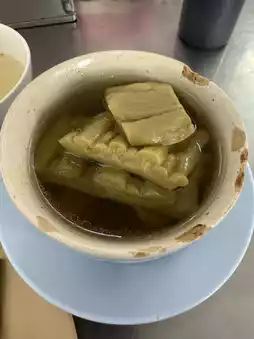 The broth that comes with the Khao Man Gai is a mild chicken broth, but the bitter melon broth packs a punch with a strong peppery kick. The bitterness of the bitter melon blends with the fatty pork, making for a flavor that's easy to understand why it's so popular.