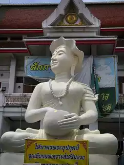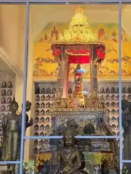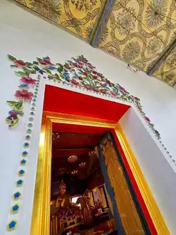 In the vihara, there is a Buddha image in the Palilayaka posture named Luang Pho Duang Dee (Wednesday Buddha), accompanied by the revered Erawan elephant.