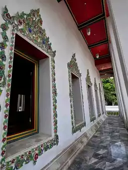 Wat Nang Chi Chotikaram is believed to have been built during the mid-Ayutthaya period. The ordination hall and the vihara lack traditional Thai architectural elements such as chofah, bai raka, and hang hong. Inside the ordination hall, the principal Buddha image in a meditation posture (known as Luang Pho Si Tis) is enshrined, surrounded by numerous other Buddha images in various postures. Behind the principal Buddha image is a reclining Buddha, which is both unique and beautiful. The interior also features murals depicting celestial assemblies and intricately decorated mother-of-pearl inlaid doors and windows with bird and floral patterns, showcasing exquisite craftsmanship.