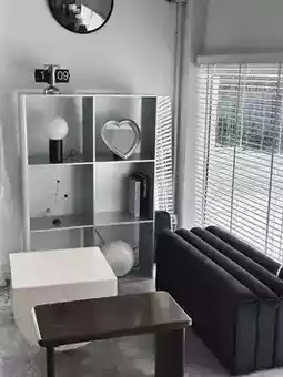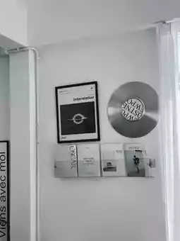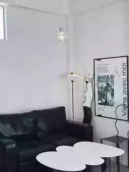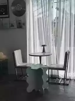 A minimalist cafe with a warm atmosphere, like you've been transported to a relaxing haven for coffee and art lovers. 🎨 The cafe is decorated in warm white tones with a touch of vintage flair. Every corner is illuminated with natural light, perfect for taking photos. 📸