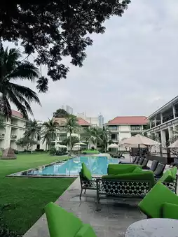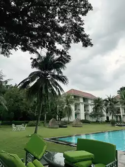 ✨ The whitewashed walls, tall windows, and green courtyards give the hotel a timeless European vibe, while the serene poolside makes it feel like a resort.