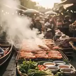 This holiday, indulge yourself with fresh air at Khlong Lat Mayom Floating Market in the Taling Chan area of Bangkok. Don't miss the first check-in spot, a photo with the iconic Khlong Lat Mayom Floating Market sign. Then, stroll along the canal to find large, bouncy grilled shrimp, fragrant with the aroma of charcoal—a must-try dish for everyone!