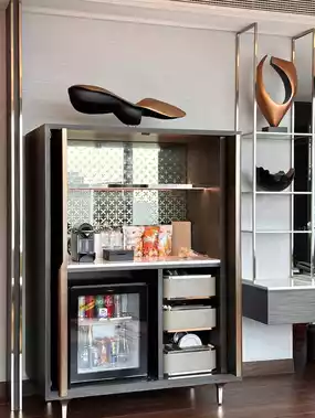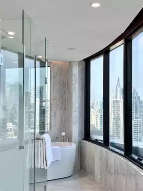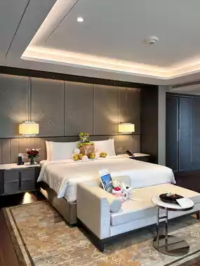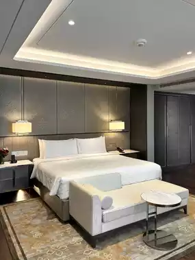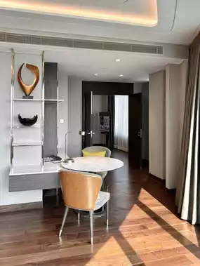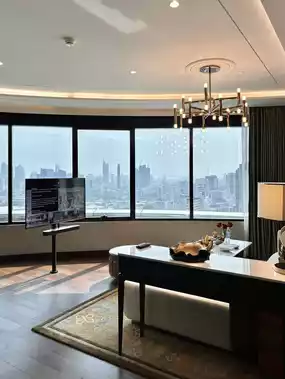 This time, I stayed in the Ambassador Suite, which is a rare room type with only two available in the hotel, located on the 34th and 35th floors. My room was on the 34th floor, and it was approximately 100 square meters, offering plenty of space. The room layout is elongated and curves along the corner of the building, divided into three main zones: the living room, the bedroom, and two bathrooms.
