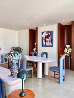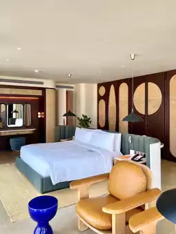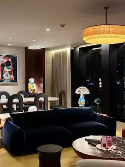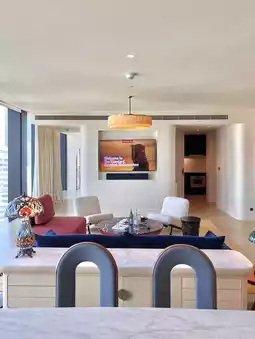 The room is perfectly proportioned, and there's a kitchen that's fully equipped with Gaggenau cookware. What I particularly like is the hotel's serious investment in the in-room sound system. This room uses high-end speakers like the Devialet Phantom II 95 dB and B&O Beosound Stage, which provide excellent sound quality.