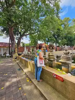 I visited the sacred holy pond of King Taksin the Great at Wat Hong Rattanaram Ratchaworawihan and was impressed by its mystical power and peaceful atmosphere. 🙏✨ Historically, it's believed that King Taksin once came here to bathe and perform important ceremonies before going to war, making the pond truly imbued with sacred power. Located in the pavilion, his statue is enshrined in the pond. 👑 The holy water is divided into four directions. 🧭 Each direction holds a different meaning for blessings, including metta mahaniyom, luck in business, healing from illness, and invulnerability! 😊 People often come here to collect the holy water to bathe in for auspiciousness and prosperity. They also come to pray to King Taksin for career advancement and debt relief. The temple's atmosphere is clean and shady, creating a sense of peace and tranquility. This is another sacred place that both religious and spiritual devotees shouldn't miss! 💖