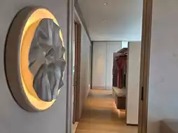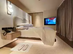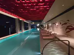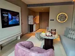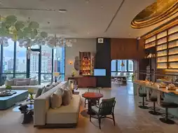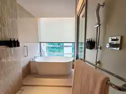 The stylishly decorated room is very spacious, with a separate living room area from the bedroom, a large sofa, large TVs in both rooms, and a fully stocked minibar. The bathroom features a separate bathtub and rain shower, complete with Harnn amenities, a premium fragrance. This fragrance is not available at the counter. Includes a welcome letter, fruit and snacks, an infinity pool on the 28th floor, and a 24-hour fitness center.
