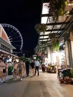 ✨️ ASIATIQUE's atmosphere is quite lively in the evenings, with a large number of international tourists. The restaurant lights reflect off the river, creating a romantic and warm atmosphere. There are beautiful photo spots, including the large ASIATIQUE Sky Ferris wheel, offering panoramic views of the Chao Phraya River and Bangkok. Alternatively, enjoy a drink on the terraces of several restaurants offering riverside views with soft music.