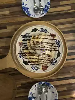 🥞Banana Ice Cream Crepe: Served with thinly sliced bananas, beautifully arranged, and topped with rich chocolate sauce, the perfect contrast to the coolness of the vanilla ice cream. The crepe is soft and buttery, melting in your mouth. 🍌✨