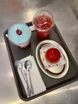 Cute cherry-themed drinks and desserts, such as pastel pink cherry cake, croissants, and cherry-decorated pastries.