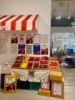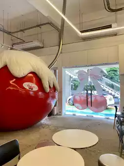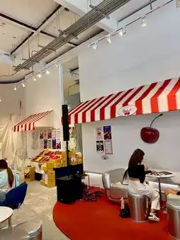 There are plenty of photo spots! There's a corner with a white round table, a corner with a large cherry cake inside, and an adorable artificial fruit market.