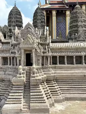 • 🌸 The temple grounds are adorned with magnificent architecture, including the cloisters with murals depicting the Ramakien, pavilions, the library, and the golden chedi that glistens beautifully in the morning sunlight ✨.