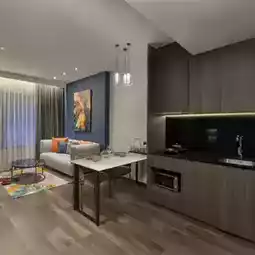 🏨 The rooms are a highlight! Decorated in a modern Scandinavian style, the gray and blue tones create a warm yet stylish atmosphere. They offer Deluxe rooms, Suites, and even rooms with kitchenettes for those who want to stay longer. 🛋️ The beds are soft and the pillows are great for a great night's sleep. 😴 The panoramic city view from the rooms is especially romantic in the evenings. 💫