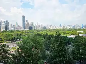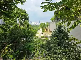 Shady atmosphere, with trees, relaxation areas, and city views, perfect for taking photos.